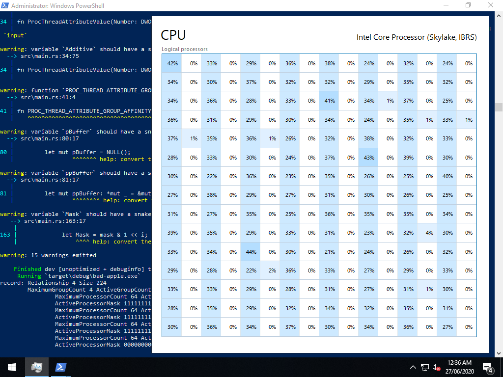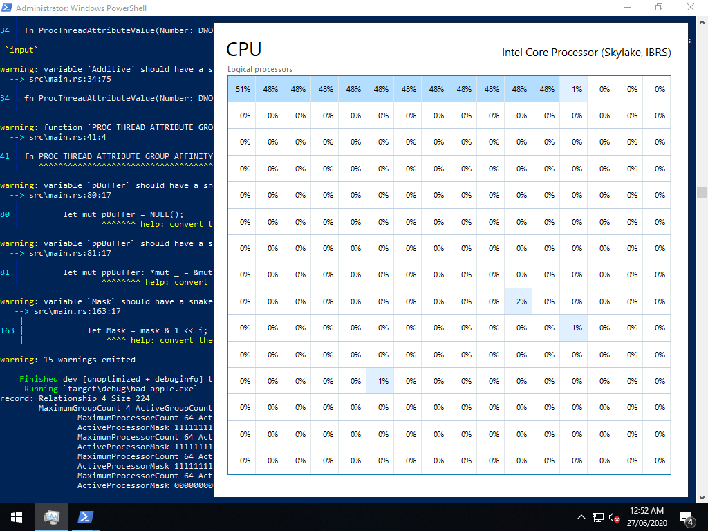 I wrote a video player for taskmgr, and it now works well enough to play Bad Apple!! on an 11x6 canvas with only a laptop and the power of virtualisation. Picture fidelity and frame rates are far better during the black-on-white shots, but at least some of the white-on-black shots managed to yield more than a complete blur.