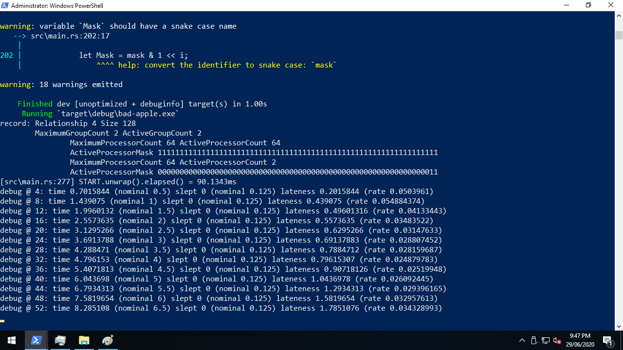But the technique that made the biggest difference to our timing problems was dropping frames. When we’re running more than 1 / fps late, not even a 100% empty frame gives us enough room for sleep adjustment that we’ll catch up completely by the end of the frame. Figuring out how the clock thread could safely communicate this to the pixel threads was difficult, but I decided to publish the next frame index with a RwLock, which I would describe as Rust’s borrowing rule plus the ability to wait.