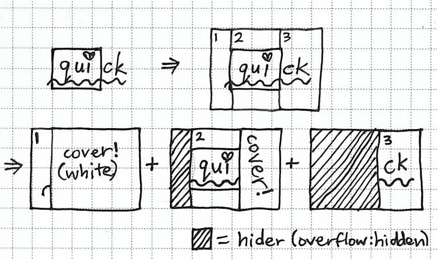This is achieved by an elaborate system of positioned “covers” and “hiders”: the former clips a layer from the right with a white rectangle, while the latter clips a layer from the left by way of right:0 wrapped in overflow:hidden.