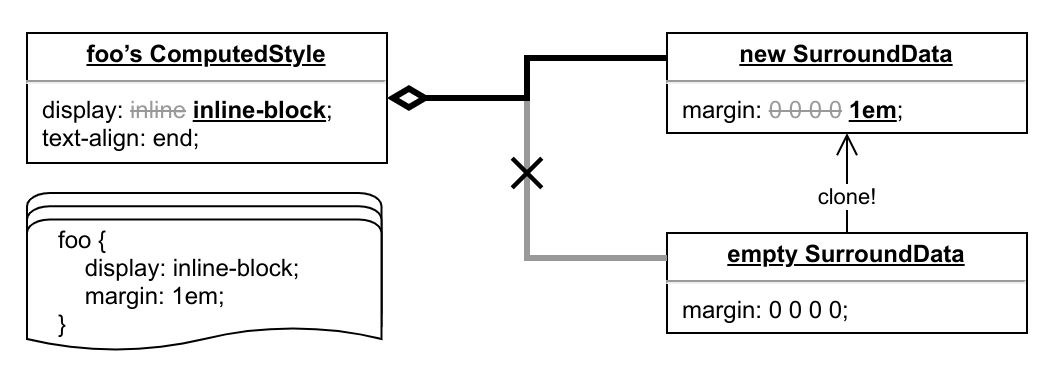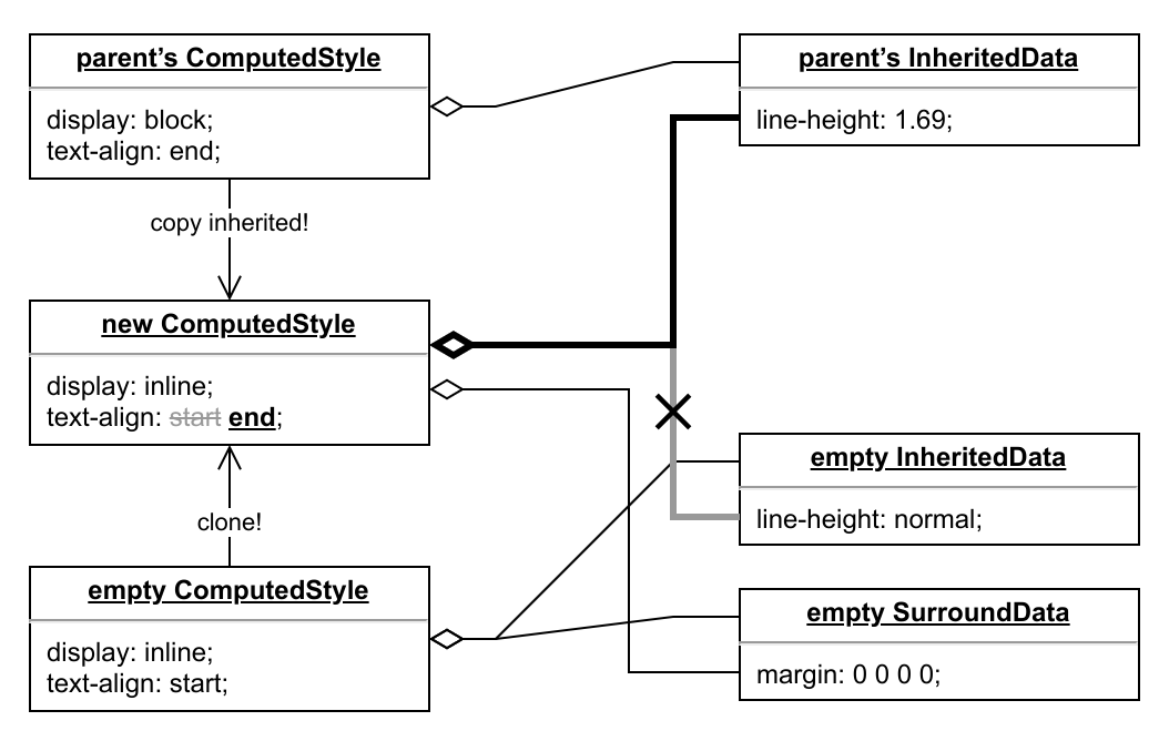 When resolving styles, we usually clone an “empty” ComputedStyle, then we copy over the inherited properties from the parent to this fresh new object. Many of these live in the “inherited” field group, so all we need to do for them is copy a single pointer. At this point, we have the parent’s inherited properties, and everything else as initial values, so if the element doesn’t have any rules of its own, we’re more or less done.