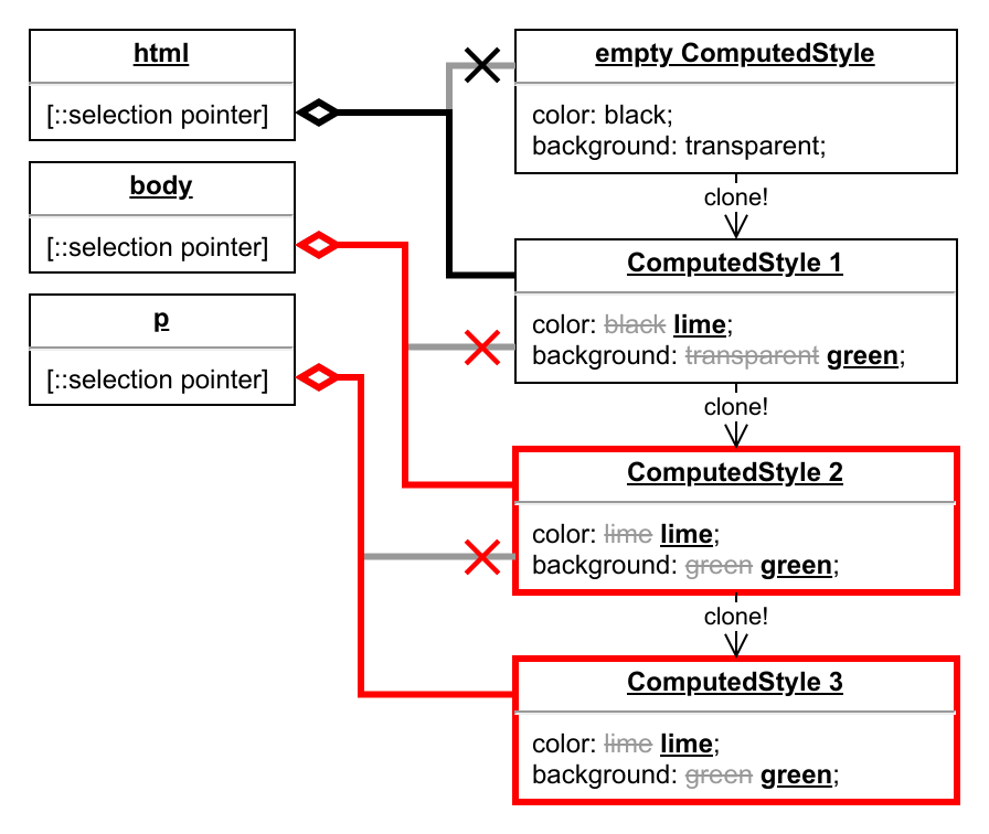Next we tried to reimplement paired cascade. For compatibility reasons, ::selection has special logic for the browser’s default ‘color’ and ‘background-color’ (e.g. white on blue), where we only use those colors if neither of them were set by the author. Otherwise, they default to initial values, usually black on transparent.